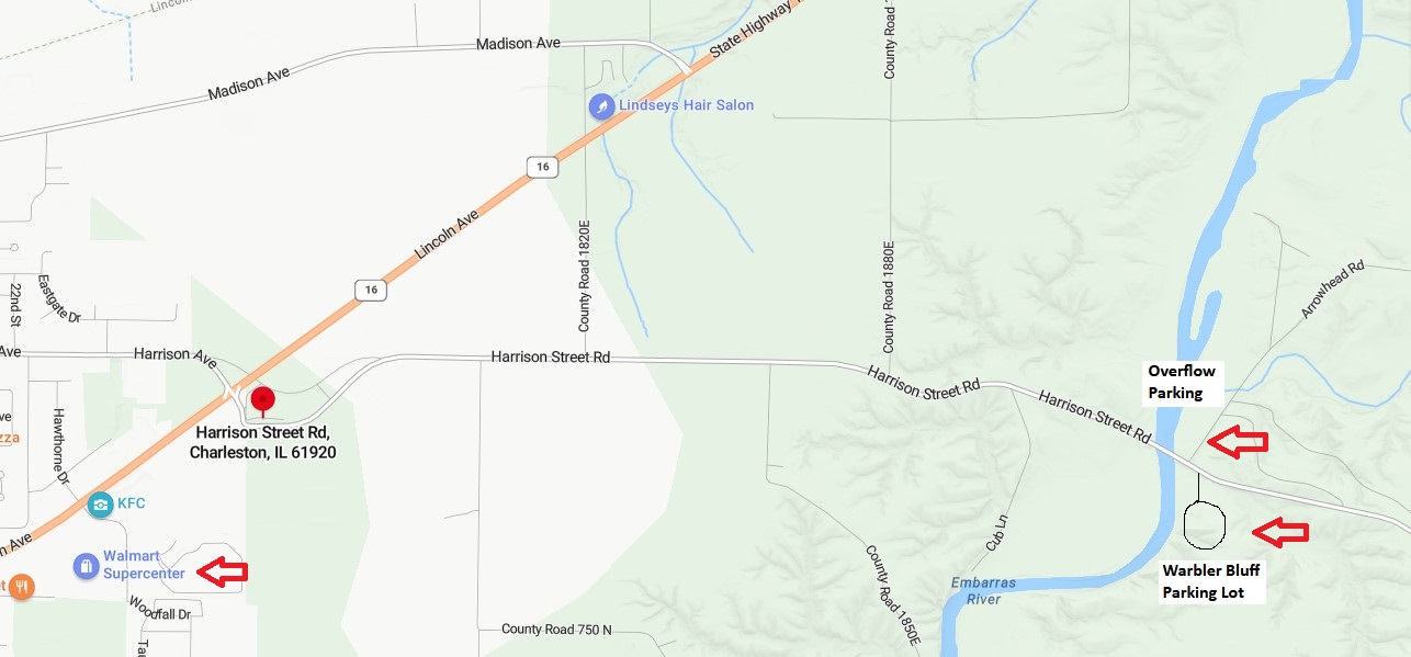 Travel East from Charleston on IL 16, Turn right onto Harrison St Rd. traveling eastward. The Bluff driveway and parking lot are on the right immediately after the Embarras River bridge.